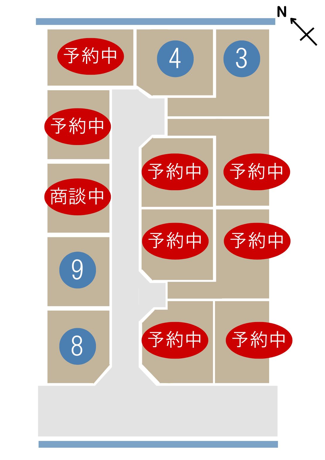 全13区画の分譲地 多治米分譲地は全13区画。落ち着いたスケール感で、ご近所との距離感もちょうどよい街づくりを目指しています。団地内道路を中心区画に配置し、車の出入りや歩行のしやすさにも配慮しています。 ※8〜12区画は三和鉄構建設株式会社の建築条件付きとなります。 |