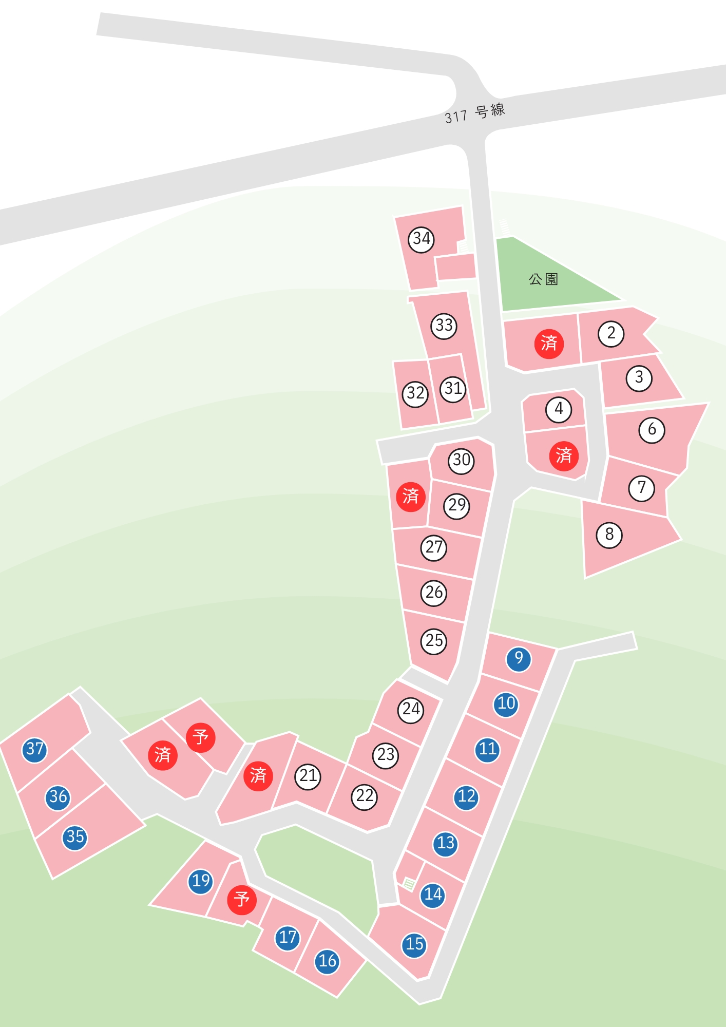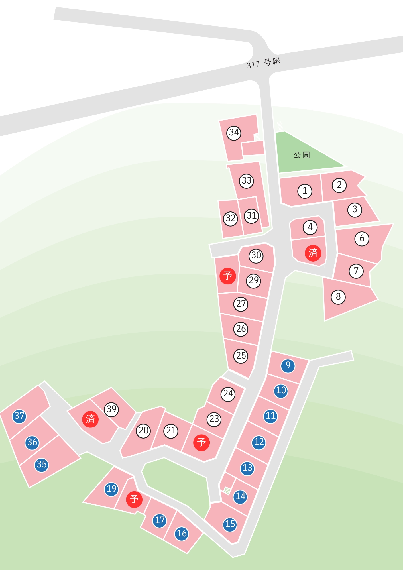 全39区画のまち並み 最多価格設定は900万円台 ※9〜19区画、35~37区画は三和鉄構建設株式会社とハウスメーカーの建築条件付きとなります。