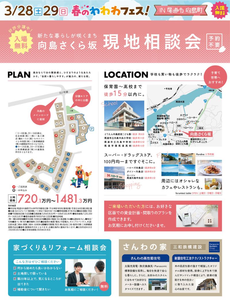 ホーム イベント報告 ''春のわわわフェス’’in向島 ◆終了しました ''春のわわわフェス’’in向島 日時:3月28日(土)・3月29日(日) 10:00~17:00場所:尾道市向島町:さくら坂分譲地 お申し込み ▽▼もっと事例が見たい方におすすめ▽▼ 写真や間取りを多数掲載!人気のカタログを無料プレゼント実施中♪ ▼▼バナーをクリックして詳細を確認▼▼ ▼▼特別価格にてモデルハウス販売中!▼▼ ▼▼気になる分譲地情報はこちら!▼▼