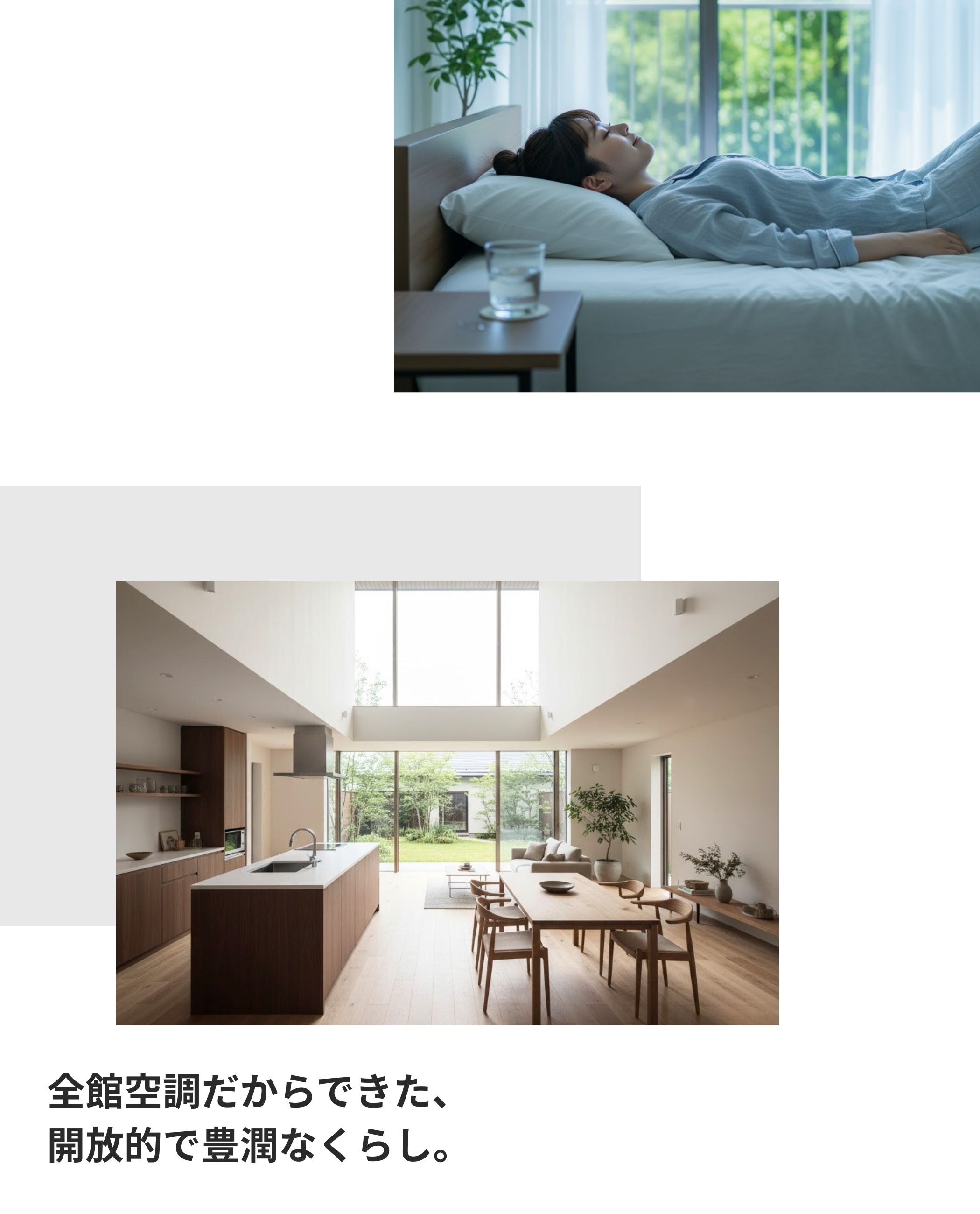 開放感いっぱいの吹き抜けリビングや、いつも家族を感じる大空間LDK。憧れの間取りでストレスフリーに暮らせたら。上質な空気が家じゅうに澄みわたる全館空調なら、これからのくらしを、住まいを、もっと豊かで心地よいものに変えられる。空気も空間も、家族一人ひとりの「心地よい」を大切にしたいから。私は「全館空調」を選びます。