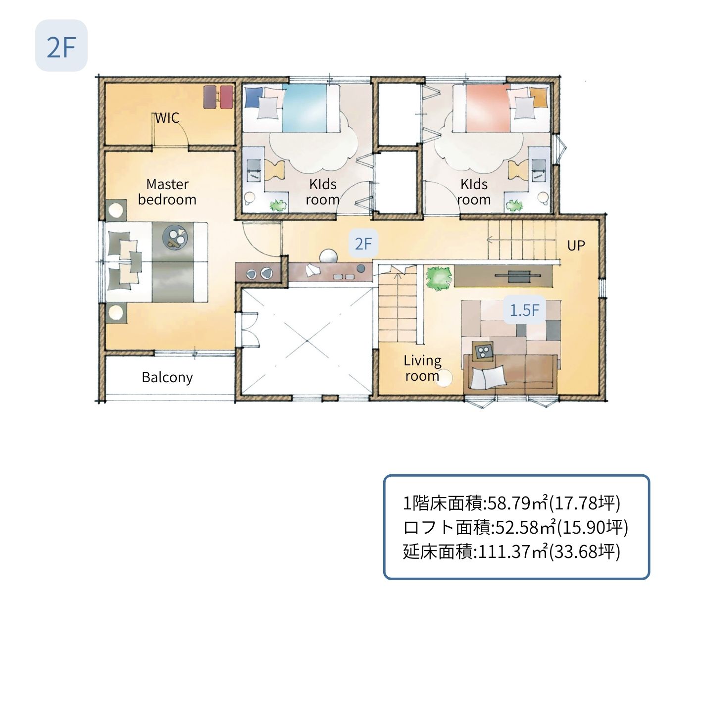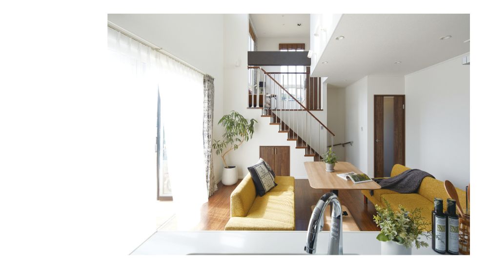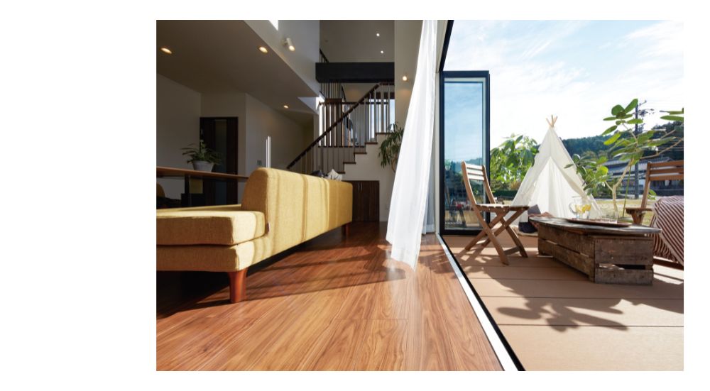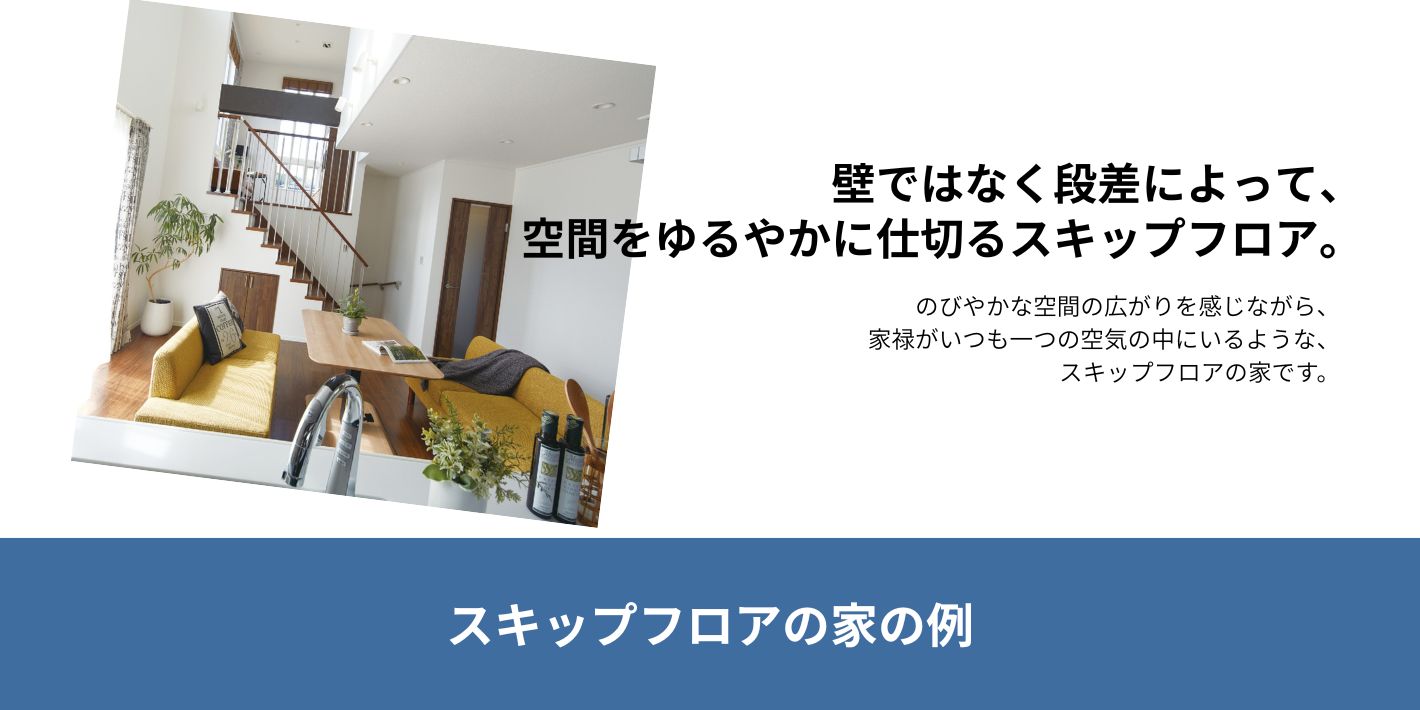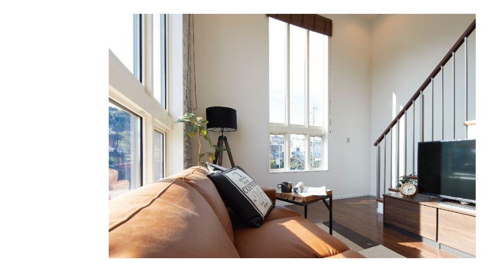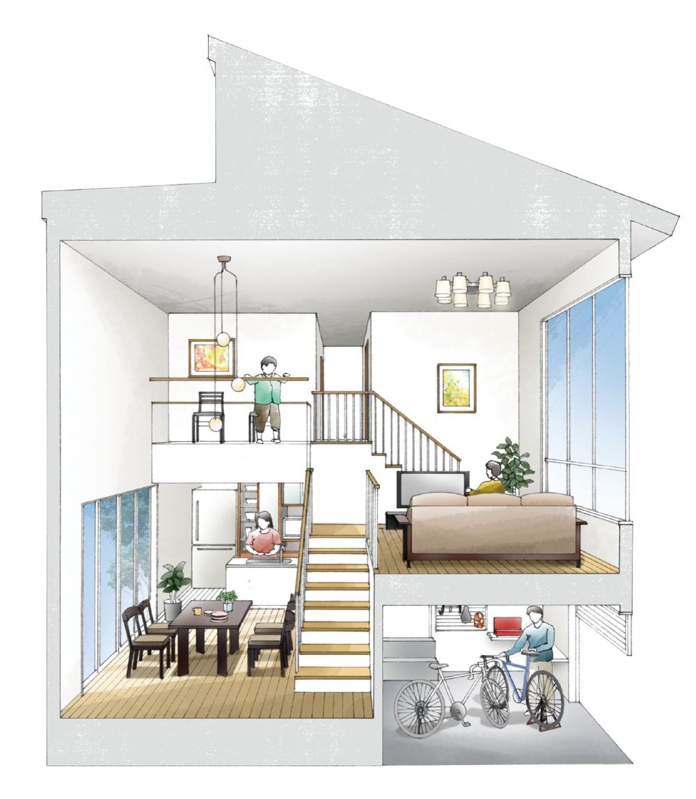 床の高さを変えながら空間をつなげることで、実際の面積以上のひろがりと書斎・スタディスペースなど“プラスα空間”が生まれるのがスキップフロアの魅力です。さらに、木造住宅をしっかり補強したオリジナル工法により、一般的な住宅を上回る最大3.8mの高天井と光が差し込む大開口を実現。心地よい開放感がひろがります。耐震性能も最高等級3を取得しているため、家族の安心と安全をしっかり守る住まいです。