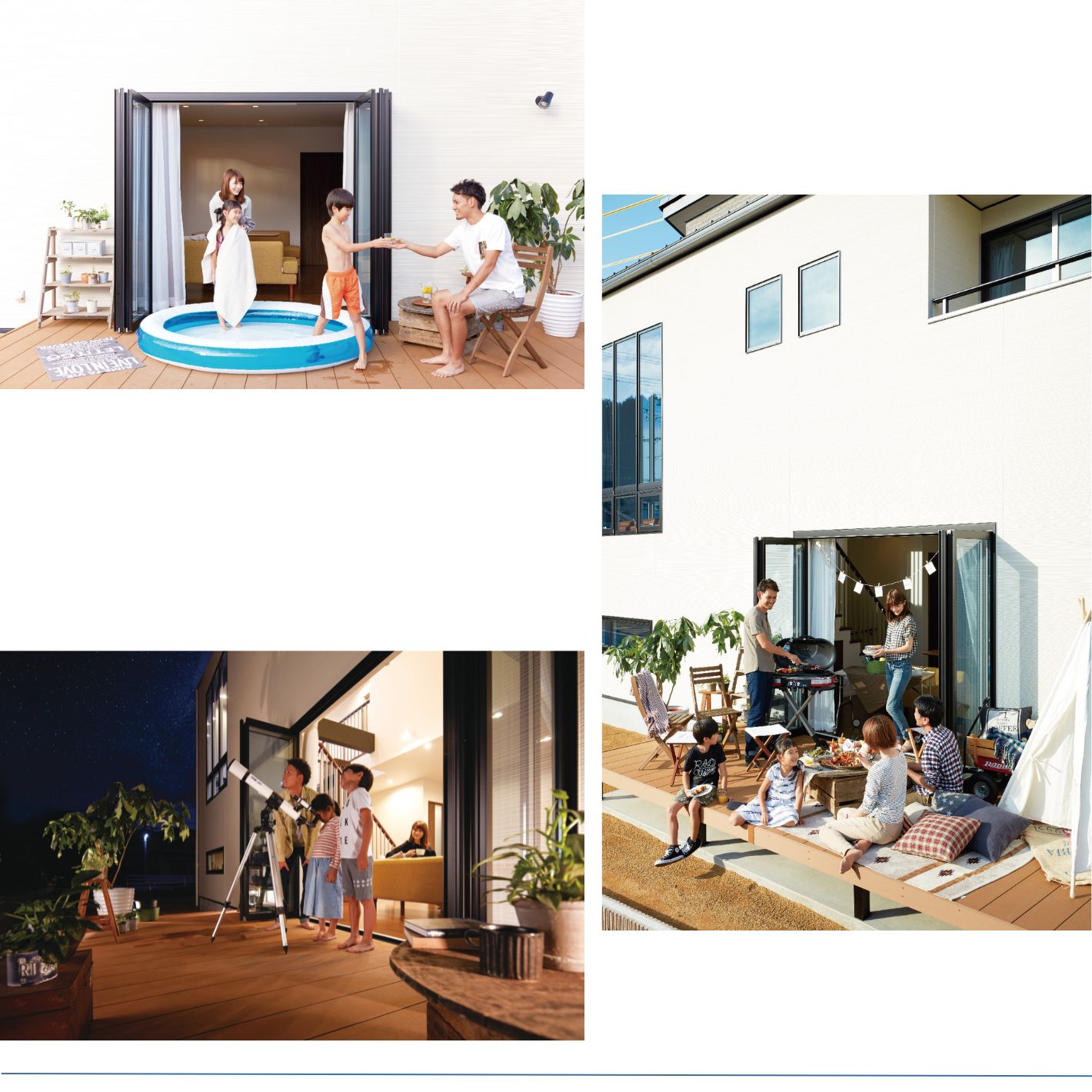 ダイニング・キッチンとゆるやかにつながるデッキは、太陽の下で思いっきり遊べるもう1つの憩いの空間。お友達を呼んでバーベキューパーティーを開いたり、プールを出して子どもたちを遊ばせたり、天体望遠鏡をセットして星空談議を楽しんだり。面積以上の広がりと、想像以上の楽しさを演出します。