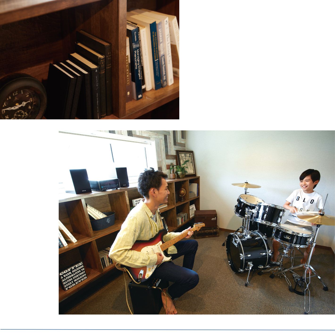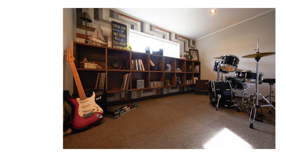 ダイニングから短い階段を下りると、そこは家族の趣味がぎゅっと詰まったフリースペース。ドラムセットやDJブースを設置して大好きな音楽を満喫したり、外とつながる大きな開口を設けて愛車のロードバイクをメンテナンスしたり、ガレージみたいな使い方も。個性の数だけ、楽しみ方がひろがります。