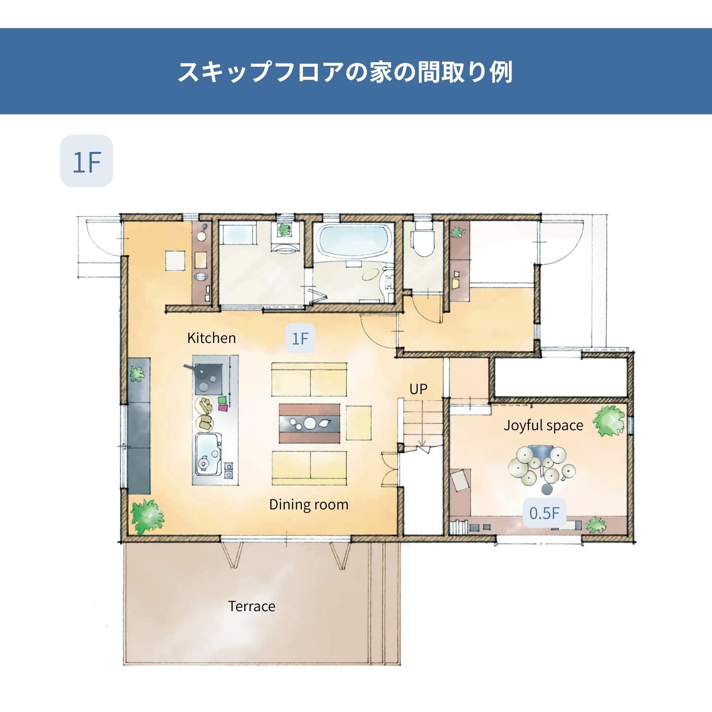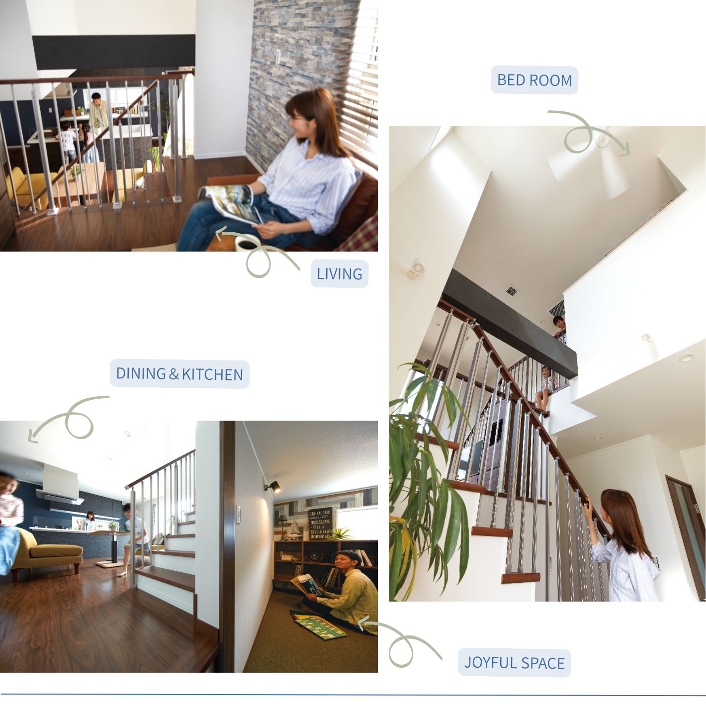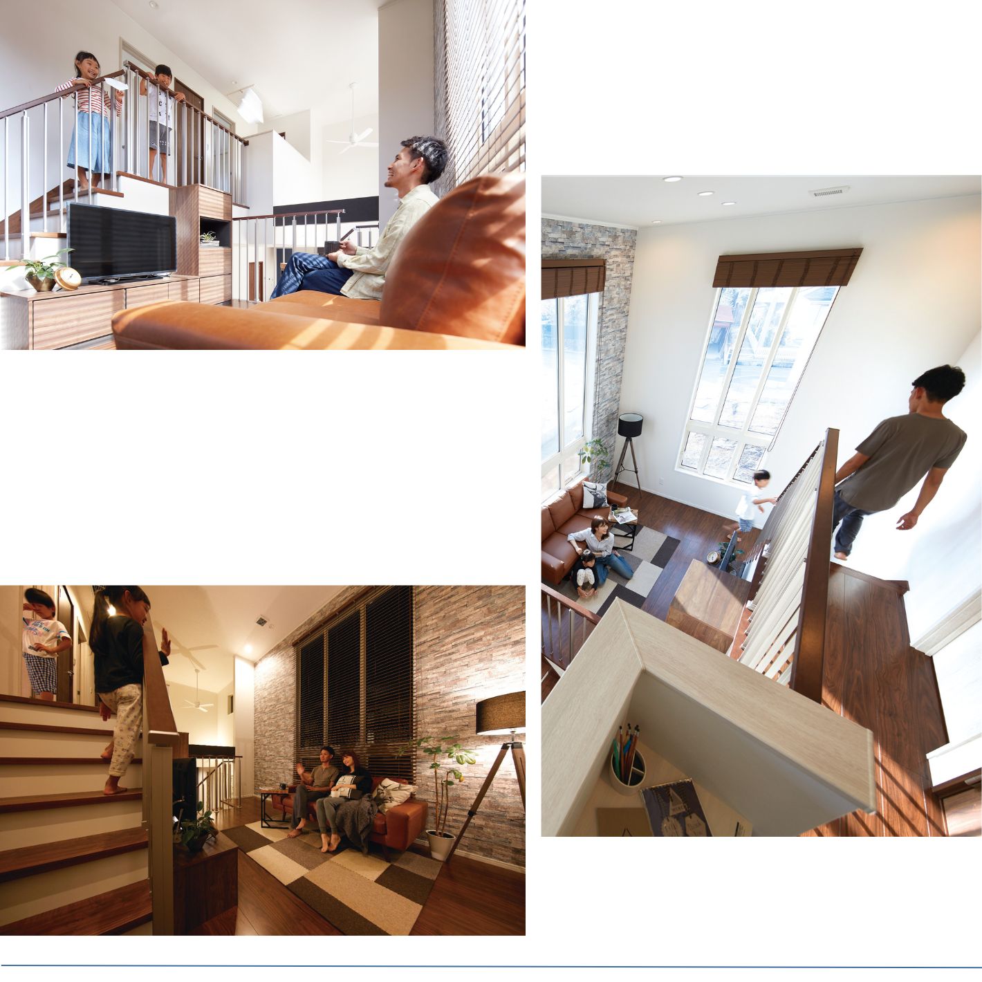 「スキップフロア」の特徴は、壁ではなく床の高さの違いで空間をゆるやかに仕切るところ。リビング・ダイニング・キッチンは、そのメリットをもっとも感じられる場所です。キッチンでお料理をしながらでも、視線の先にはダイニングでくつろぐご主人。斜め上に目をやれば、リビングで仲良く遊ぶ子どもたちの姿。家族がいつも、一つの空気の中にいる。そんなかけがえのない「つながり」を感じられる空間です。