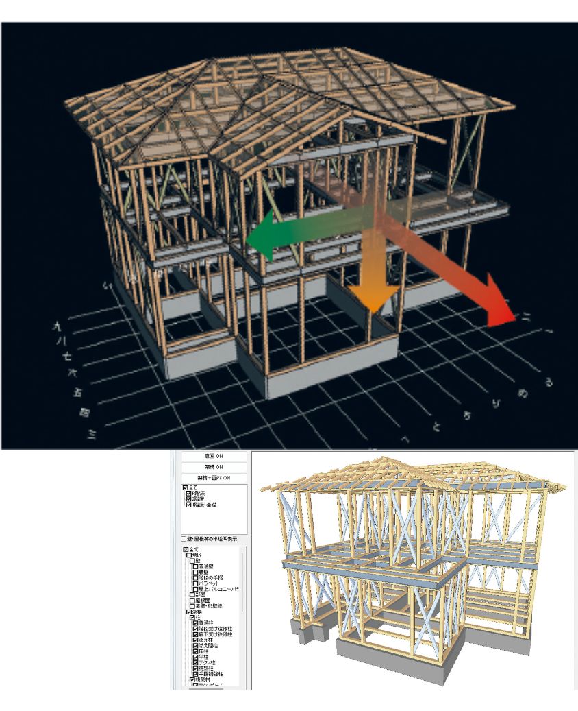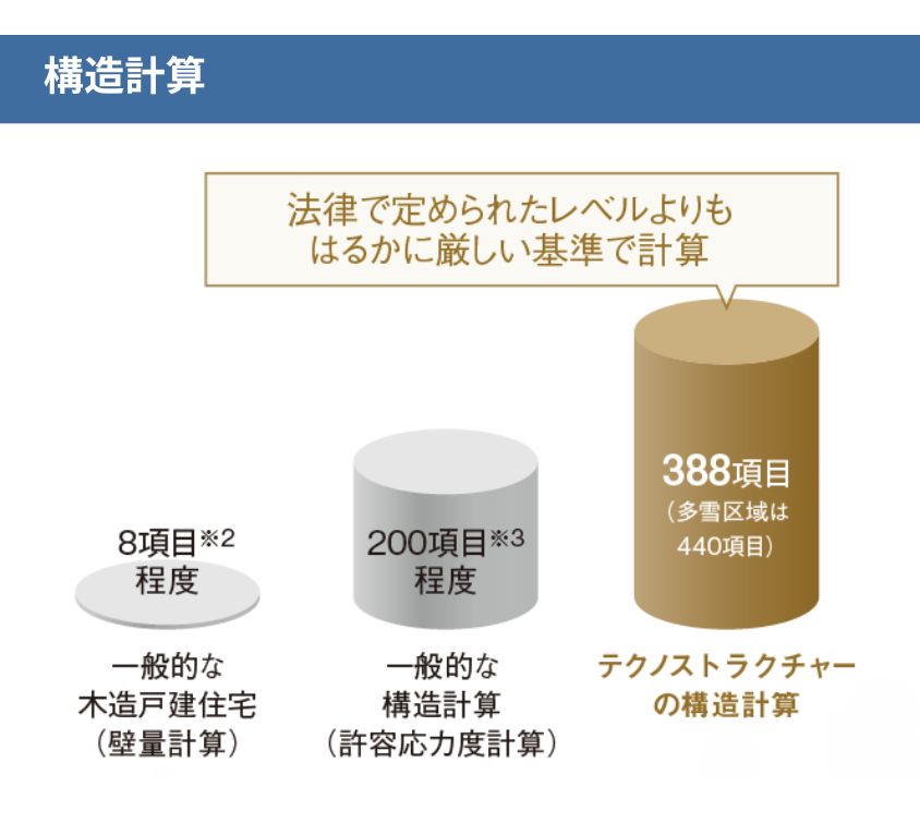 構造計算とは、地震・耐風・豪雪など家にどのような力が加わるかを計算し、その力に住まいが耐えられるかどうかを検証するもの。いわば「住まいの災害シミュレーション」のようなものです。法律の基準をはるかに上回る388項目の細かく厳しいチェックを行います。構造的に負担のかかるすべての部位の強度と建物全体のバランスを緻密に確認するから、地震への強さに自信を持っています。