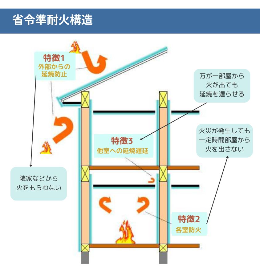 テクノストラクチャー工法は、テクノビームで構成される床・屋根の耐火性能を検証して耐火構造の国土交通大臣認定を取得しており、耐火建築物の建設が可能です。「省令準耐火構造」とは、防火性能をもつ構造として、主に以下の3つの特徴を持っています。