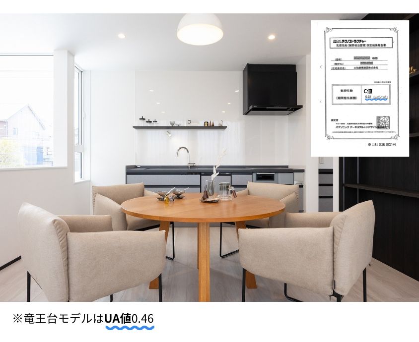 省エネルギー住宅やゼロエネルギー住宅(ZEH)の普及に伴い、住宅の断熱性や気密性を客観的に評価する基準が重要になってきました。UA値(外皮平均熱貫流率)とは、住宅の屋根、壁、窓、床などの外皮部分から、どれだけ熱が逃げやすいかを示す値で、数値が低いほど断熱性能が高いことを意味します。一方、C値(隙間相当面積)は、室内の空気が外に漏れたり、外気が入り込んだりする隙間の広さを示す指標で、こちらも数値が小さいほど気密性が高く、快適な室内環境を保ちやすくなります。当社モデル住宅のUA値は0.46、C値の実測値例としては0.22を記録しています。これは、省エネ基準をクリアする断熱性能を備え、かつ高い気密性を実現している証拠です。