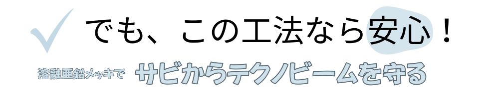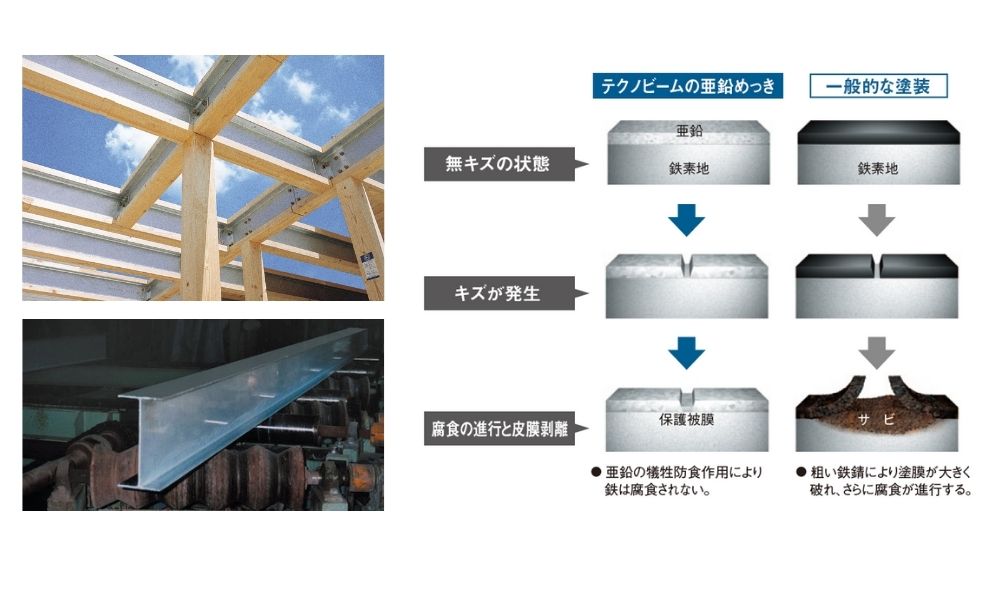 テクノビームには、鉄部分に防錆作用に優れた溶融亜鉛メッキ処理を施し、サビに強い構造としています。亜鉛は鉄よりも先に反応する性質があるため、万一鉄が露出しても亜鉛が先に反応して緻密な保護被膜を作ります。これを犠牲防食作用と言い、亜鉛が鉄そのものを錆や腐食から守ってくれます。