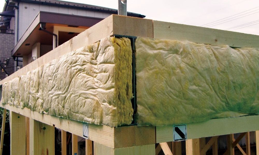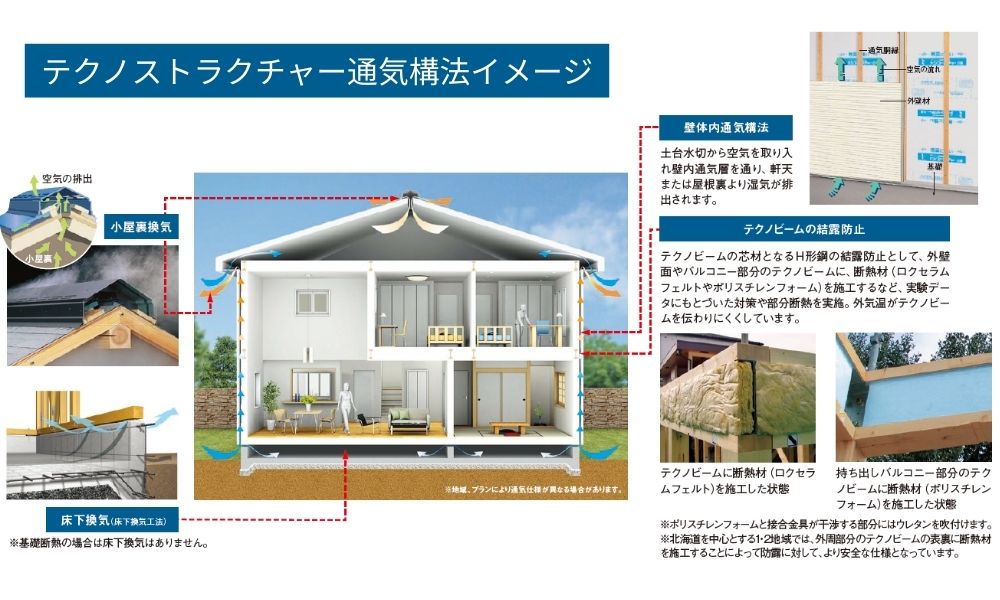 テクノビームの芯材となるH型鋼の結露防止として、外壁面やバルコニー部分のテクノビームに、断熱材(ロクセラムフェルトやポリスチレンフォーム)を施工するなど、実験データに基づいた対策や部分断熱を実施しています。外気温がテクノビームに伝わりにくくしています。