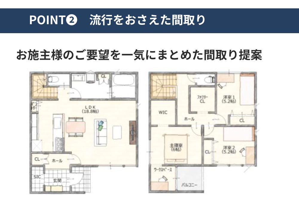 例えば、家族みんなで集える広々LDK、土間収納などの適材適所の収納、室内干しできる広々洗面室、キッチンと洗面室の家事ラク動線など、今どきの施主様にもご納得いただける間取りです。