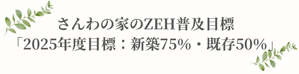 ホーム 家づくり ⑳ZEH ZEH ZEH 「ZEH(ネット・ゼロ・エネルギー・ハウス)」とは、住宅の高断熱化及び高効率設備の導入により、できる限り省エネルギーに努めた上で、太陽光発電などの再生可能エネルギーで、年間の一次エネルギー消費量が「正味ゼロまたはマイナスの住宅」のことを指します。 さんわの家は、2025年までのZEH普及率目標を以下の通り定め、その普及に努めるとともに、不要なエネルギーを使わないライフスタイルの啓発を進めることで、地球環境の保全と、お客様の快適で豊かな暮らしの実現に貢献します。